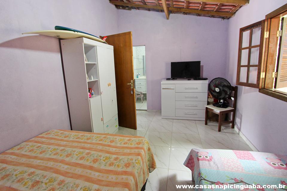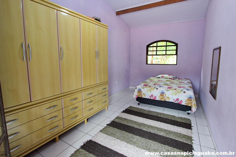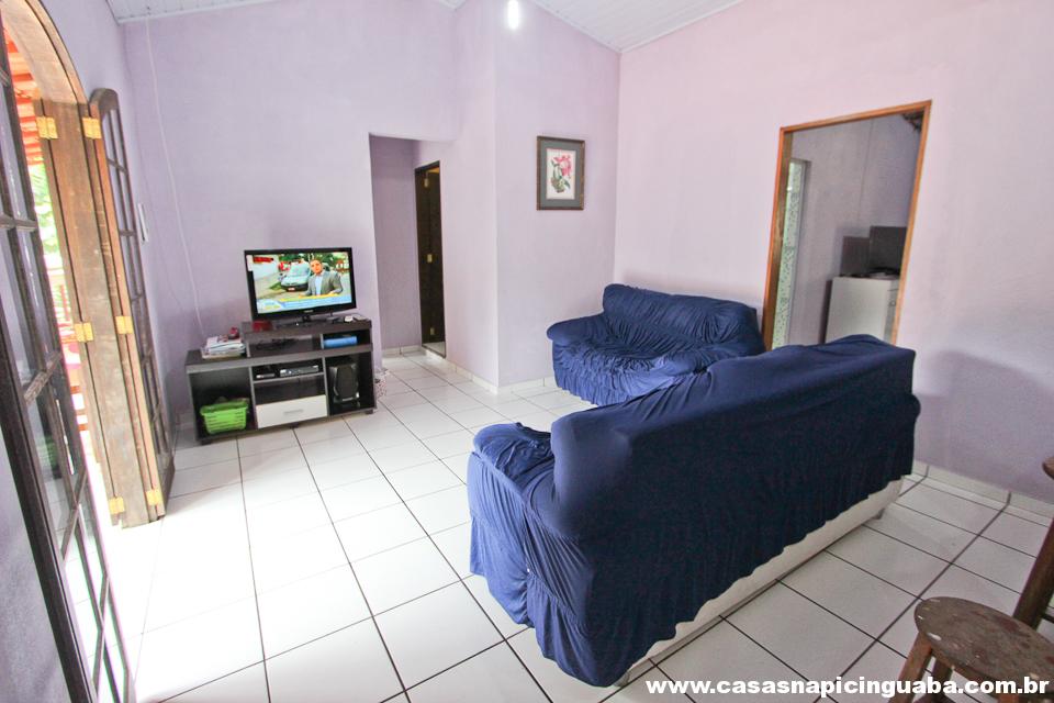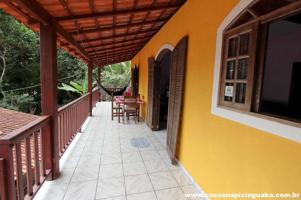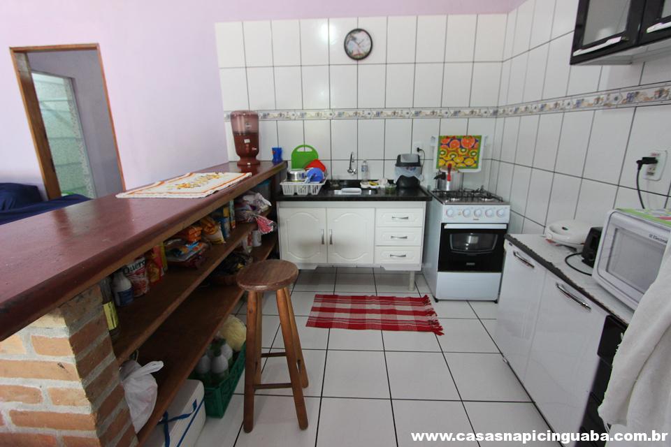 A casa possui uma sala equipada com TV e sofá, uma cozinha completa conjugada, um quarto com cama de casal e um segundo quarto com duas camas de solteiro. Além disso, há um banheiro, uma varanda com vista panorâmica e uma churrasqueira de alvenaria.